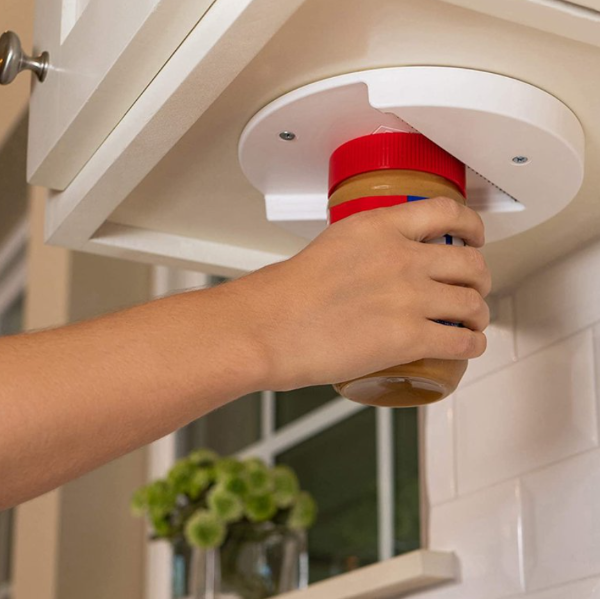 La solución práctica para abrir frascos sin esfuerzo. Se instala en la parte inferior de gabinetes o mesadas. Sus dientes metálicos sujetan firmemente la tapa, mientras que el diseño en “V” facilita el ajuste a envases grandes o pequeños.