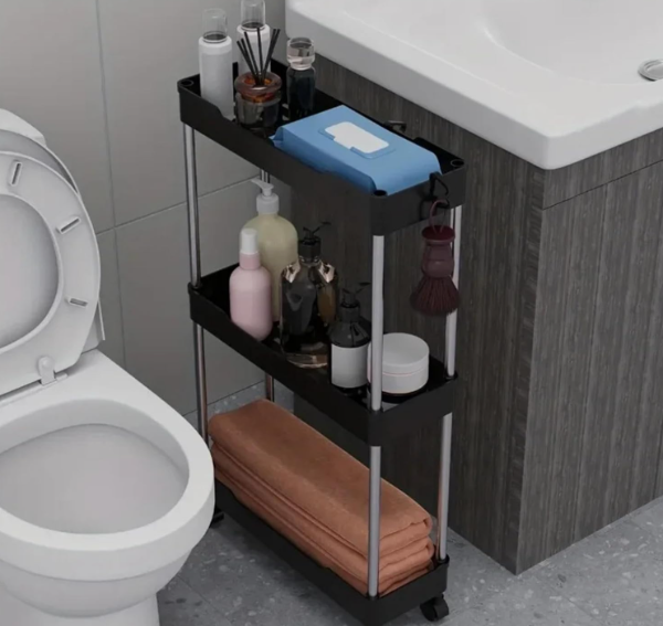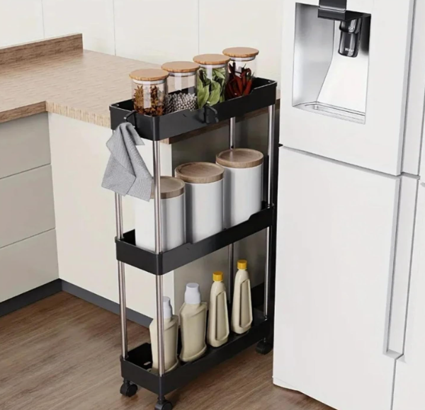 Especialmente diseñado para adaptarse a esos pequeños “huequitos” que tenemos entre los muebles de la cocina, el baño o el lavadero. Este organizador es de plástico, tiene 3 pisos y viene con ruedas en su base, para un mayor desplazamiento.