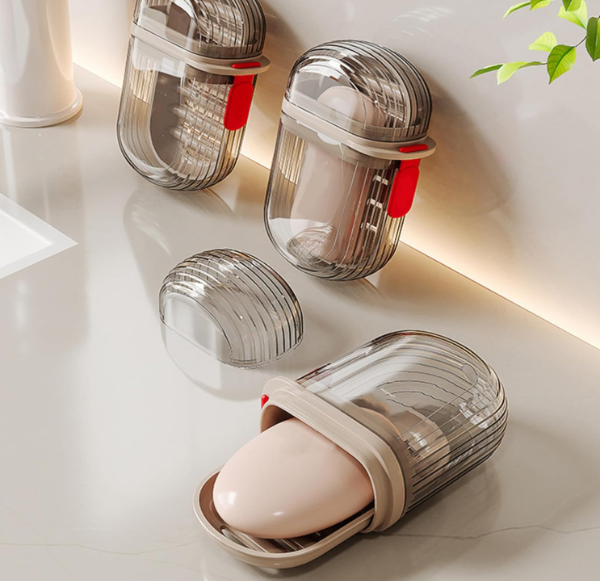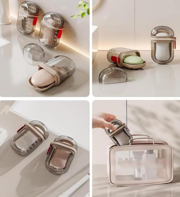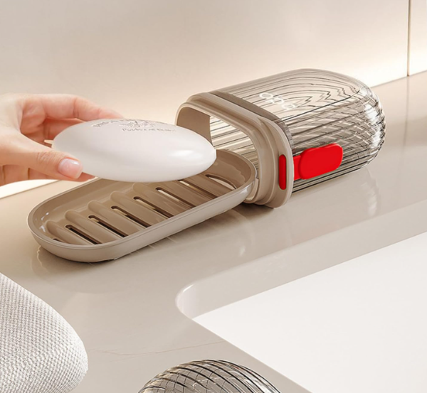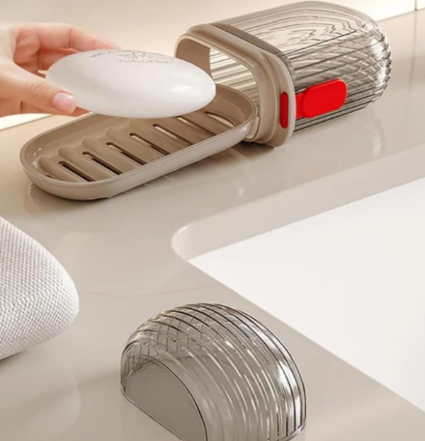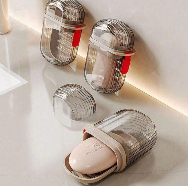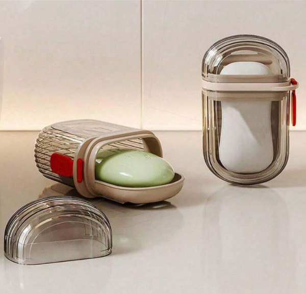 Jabonera con tapa diseñada ideal para viajar, cuenta con una bandeja en el interior para apoyar jabón y trae una correa para un mejor agarre